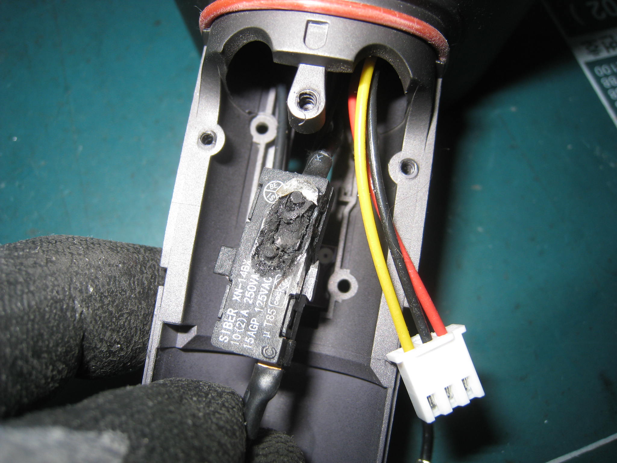 스위치를 열어보면 내부에서 터진 고장이 보입니다.